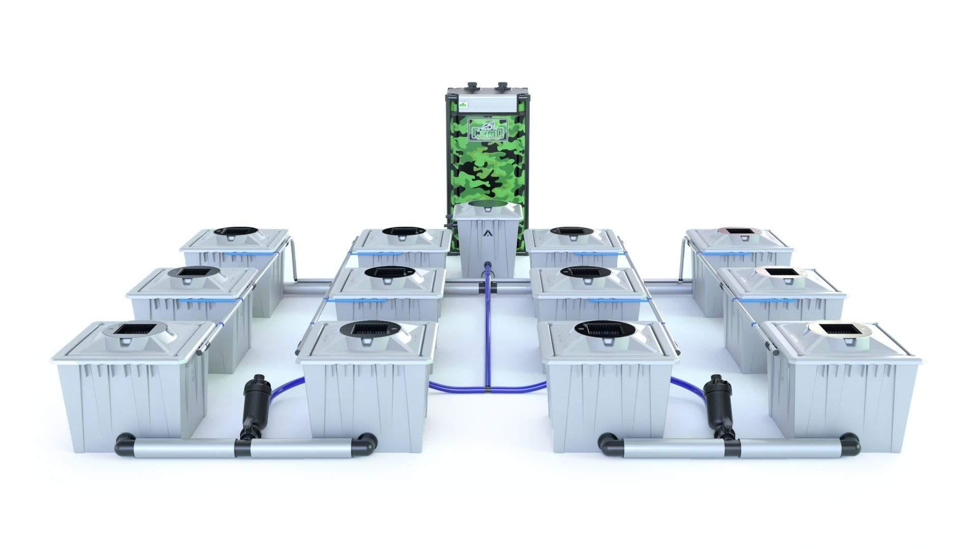 Minimale Stellfläche: Länge: 1,7 m Breite: 1,8 m (Töpfe so nah wie möglich beieinander – ohne Tank)Maximale Stellfläche: Länge: 2,3 m Breite: 2,7 m (mit der mitgelieferten Schlauchlänge) (75 cm Pflanzenabstand)