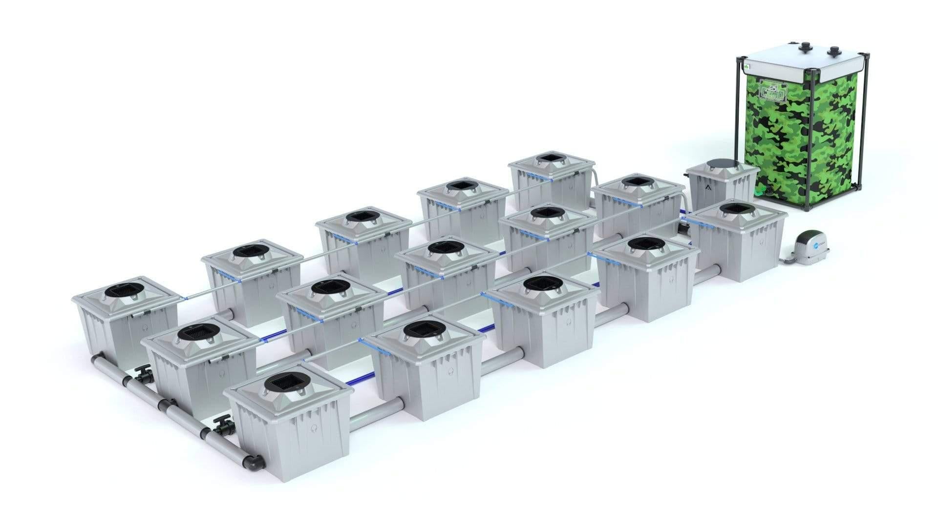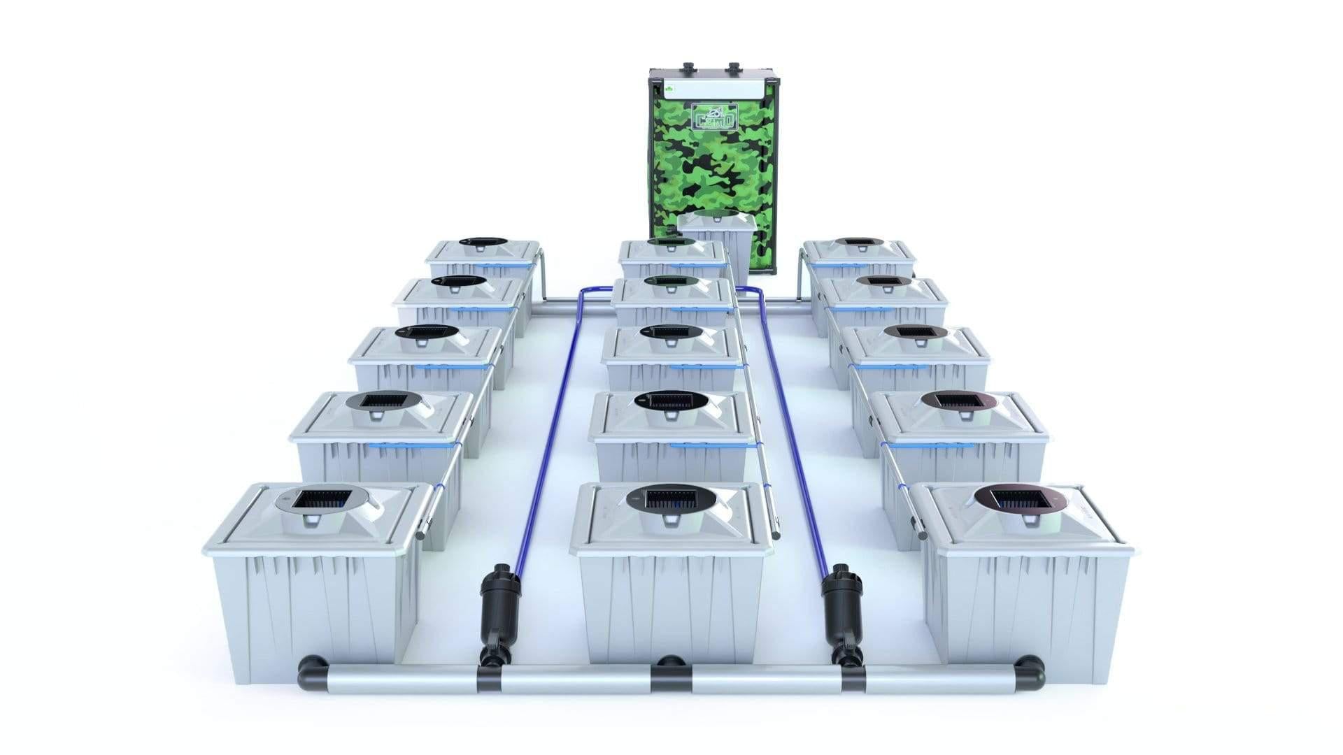 Minimale Stellfläche: Länge: 2,65 m Breite: 1,35 m (Töpfe so nah wie möglich – ohne Tank)Maximale Stellfläche: Länge: 3,4 m Breite: 1,9 m (mit gelieferter Rohrlänge) (75 cm Pflanzenabstand)