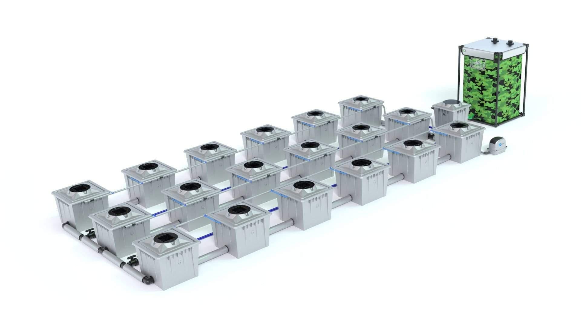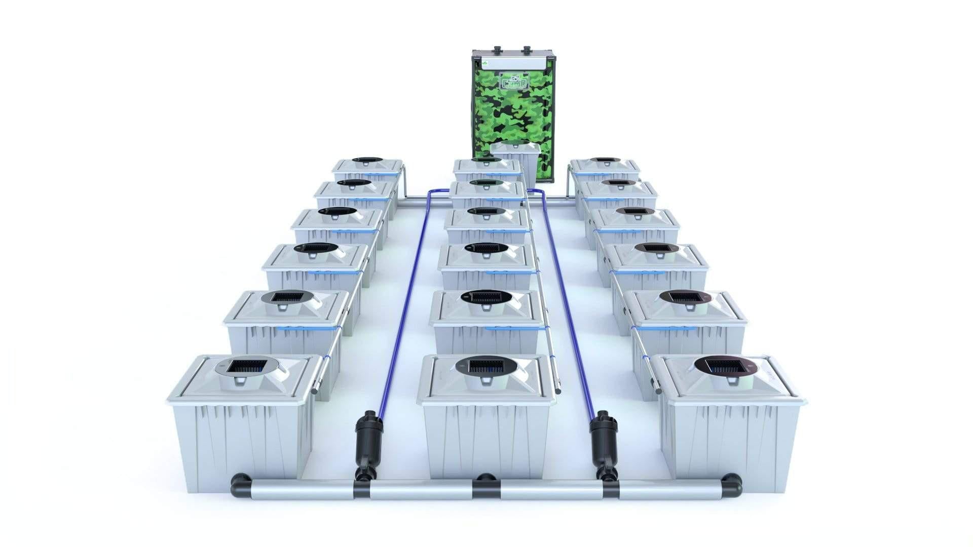 Minimale Grundfläche: Länge: 3 m Breite: 1,35 m (Töpfe so nah wie möglich – ohne Tank)Maximale Grundfläche: Länge: 4,5 m Breite: 1,9 m (mit der mitgelieferten Rohrlänge) (Pflanzenabstand 75 cm)