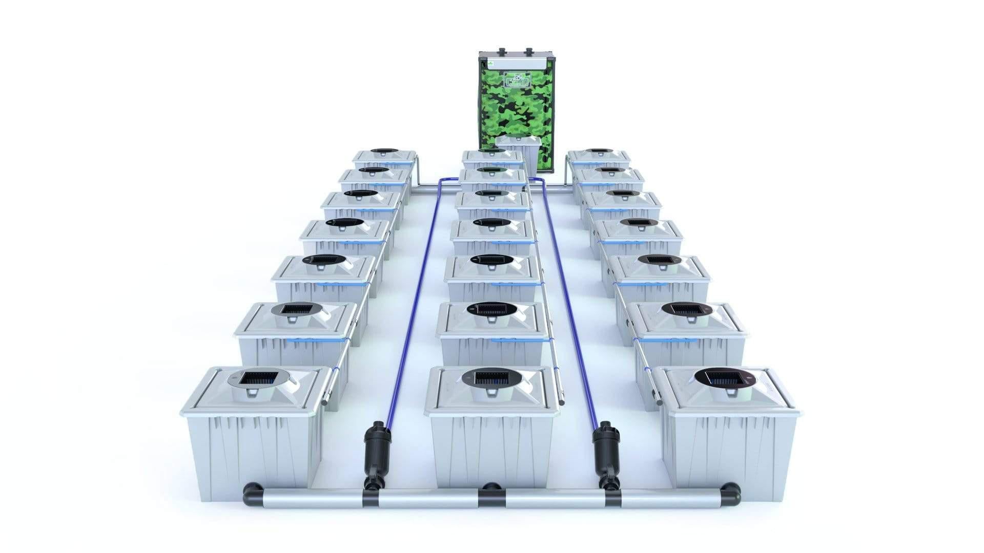 Mindest-Stellfläche: Länge: 3,6 m Breite: 1,35 m (Töpfe so nah wie möglich – ohne Tank)Maximale Stellfläche: Länge: 5,25 m Breite: 1,9 m (mit mitgelieferter Rohrmenge) (75 cm Pflanzenabstand)