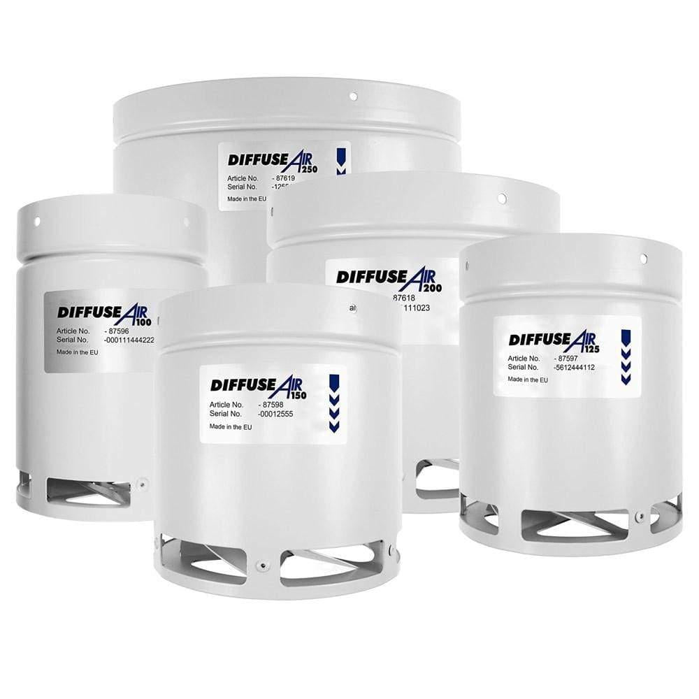 Alles, was Sie tun müssen, ist, das Gerät an einem Abluftventilator der passenden Größe zu befestigen und anschließend aufzuhängen. Vier Löcher an der Oberseite ermöglichen die einfache Verschraubung mit einem Abluftventilator und jeder DiffuseAir wird mit Aufhängeplatten geliefert. Seilaufhängungen oder Ketten sorgen für eine bequeme und sichere Montage!