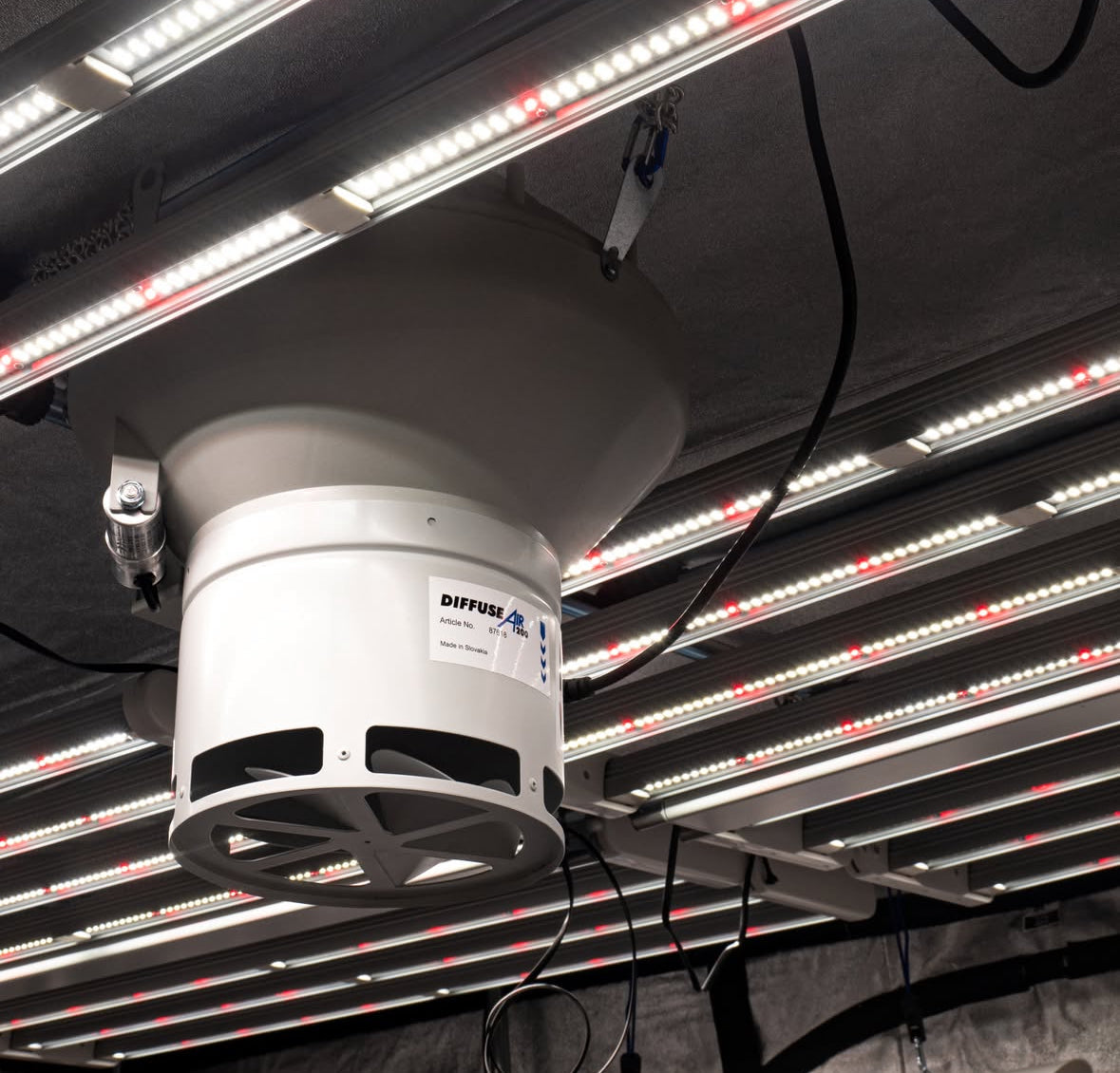 Alternativ können Sie es als eigenständiges System nutzen, um die bereits im Growroom befindliche Luft effektiv zu vermischen. Die Luft wird von oben aus dem Growroom angesaugt und das DiffuseAir-System verteilt sie oberhalb des Pflanzendachs, wodurch ein gleichmäßiger Luftaustausch zwischen Beleuchtung und Pflanzen erreicht wird. In großen Growräumen können Sie auch mehrere DiffuseAir-Systeme verwenden, um die Luft optimal zu verteilen.