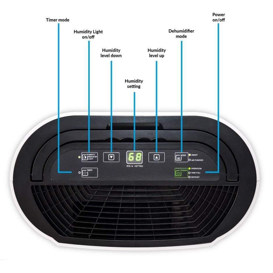 - Digitaler Hygrostat mit hintergrundbeleuchtetem LCD, das die aktuelle Raumfeuchtigkeit anzeigt, sowie farbige LED-Anzeige (Grün, Orange und Rot) zur schnellen und einfachen Kontrolle des Feuchtigkeitsniveaus