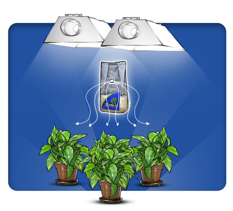 Der ExHale ist für kleine bis mittlere Anbauflächen konzipiert und versorgt 4 bis 6 Pflanzen mit dem benötigten CO2. Für größere Flächen werden mehr Beutel benötigt – die Wirkung bleibt aber gleich!
