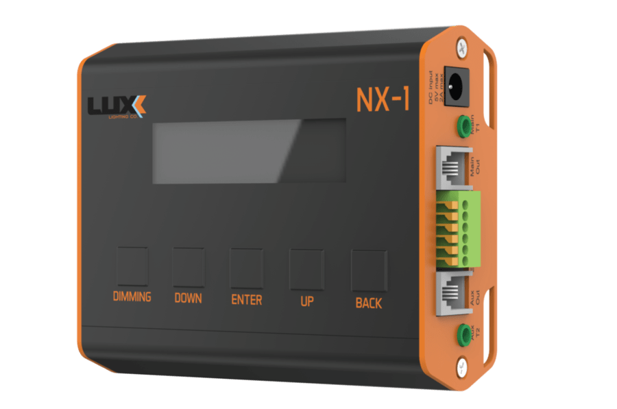 Der Luxx NX-1 Licht-Controller ist ein einfaches und leistungsstarkes System zur Steuerung Ihrer Beleuchtungsanlagen. Er ist mit allen Luxx Lighting-Leuchten kompatibel. Eine Gruppe von bis zu 40 Luxx Lighting LED-Leuchten kann sowohl am Haupt-RJ9-Port als auch am Hilfs-RJ9-Port des Controllers angeschlossen werden.